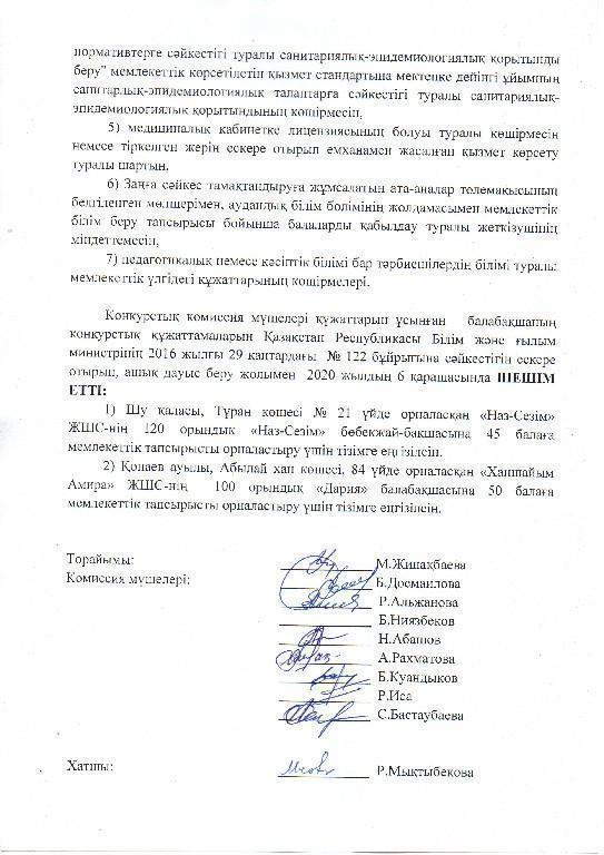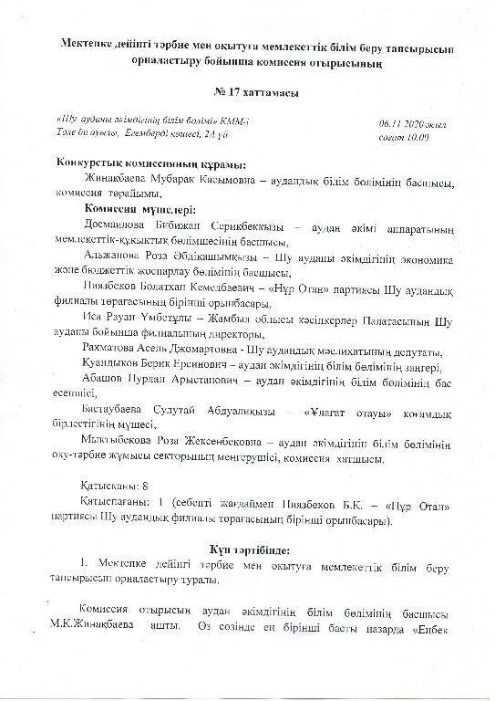 *ШУ АУДАНЫ ӘКІМДІГІНІҢ БІЛІМ БӨЛІМІ » Конкурс » Мектептке дейінгі тәрбие мен оқытуға мемлекеттік білім беру тапсырысын орналастыру бойынша комиссия отырысының №17 хаттамасы